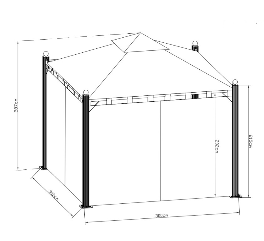 В данном товаре тент-крыша. Размеры беседки (ДхШхВ), в сантиметрах 300x300x287